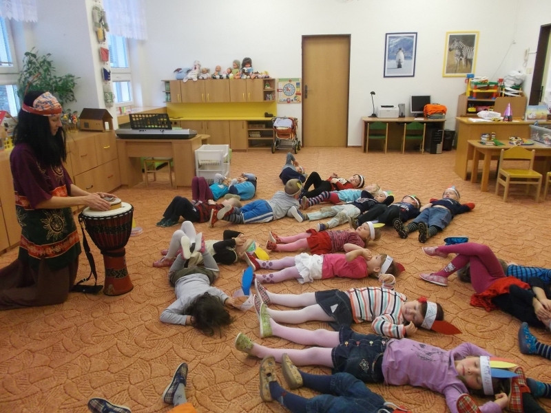 Bubnování, zábavné muzicírování, naslouchání hudbě a vyjádření hudby a rytmů pohybem.